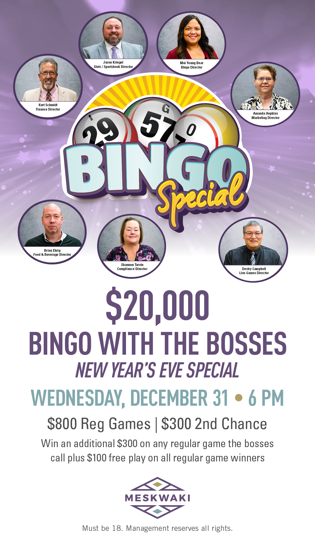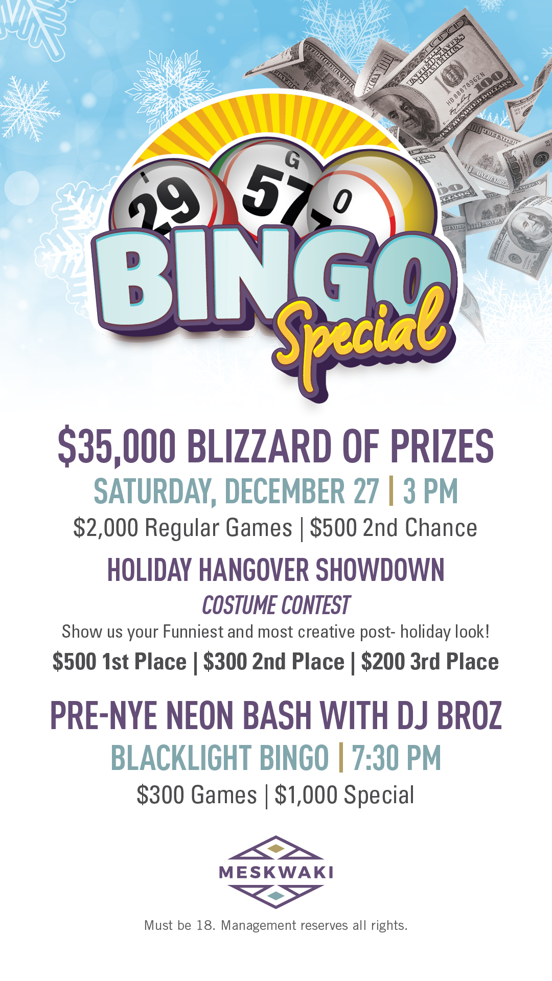 Make it a celebration! Play Bingo on your birthday at Meskwaki and you’ll receive $20 off a bingo admission with a valid I.D. If your birthday falls on a Monday or Tuesday when we are closed, your birthday bingo will be valid on Wednesday of the same week.
