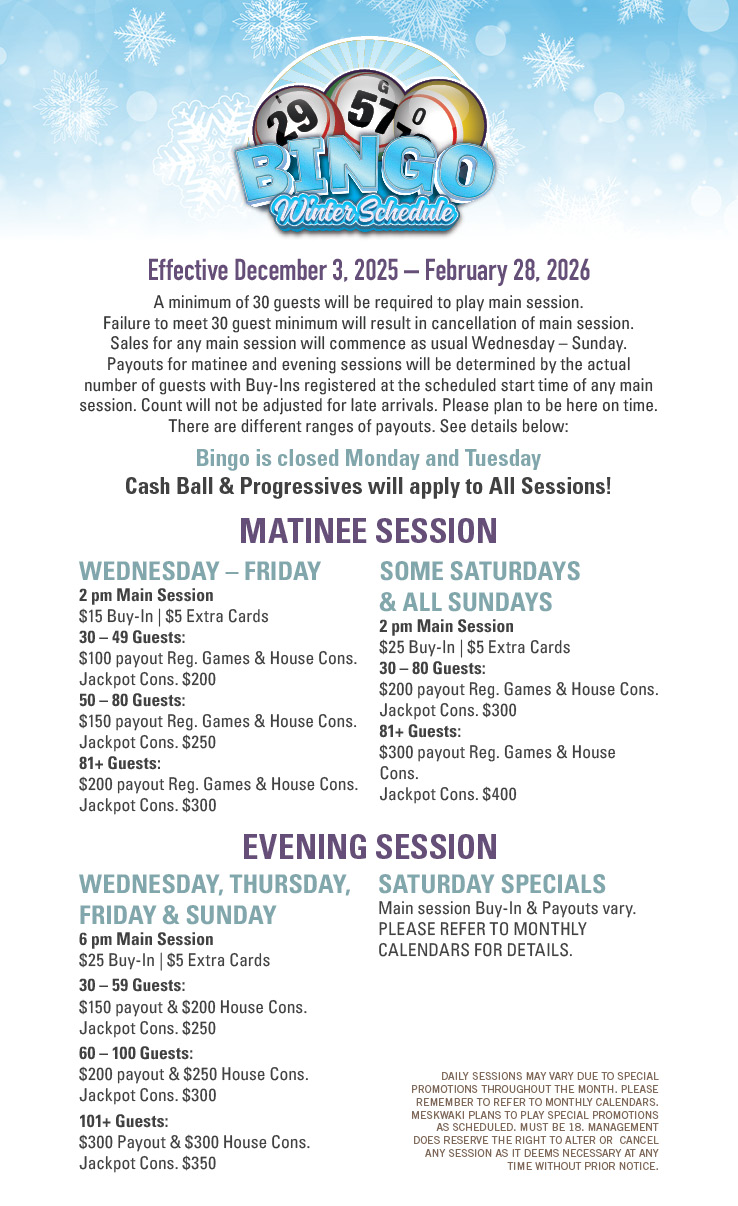 • All guests must be 18 or older to play Bingo. (Valid ID required)